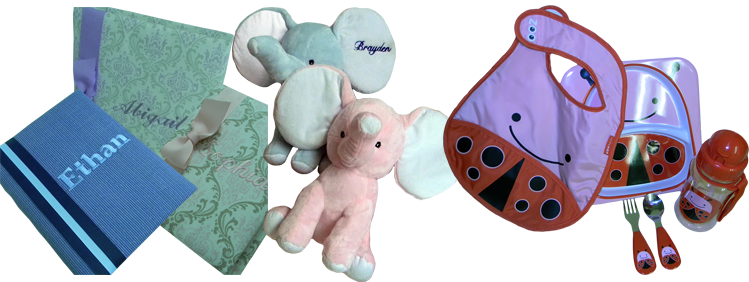 Your source for great Personalized Gifts, Monogrammed Gifts, Embroidered Gifts, Keepsake Gifts, Customized Gifts, Baby Gifts, New Baby Gifts, Personalized Bibs, Personalized Onesies, Personalized Diaper Totes, Personalized Diaper Bags, Monogrammed Duvet Covers, Monogrammed Guest Towels, Monogrammed Robes, Monogrammed Sheet Sets, Personalized Robes, Monogrammed Baby Blankets, Baby Shower Gifts, Wedding Gifts, monogrammed Towels, Personalized Towels, Personalized Totes, Personalized Bags, personalized burps, monogrammed aprons, personalized backpacks, personalized lunch boxes, personalized boudoir pillows, monogrammed boudoir pillows